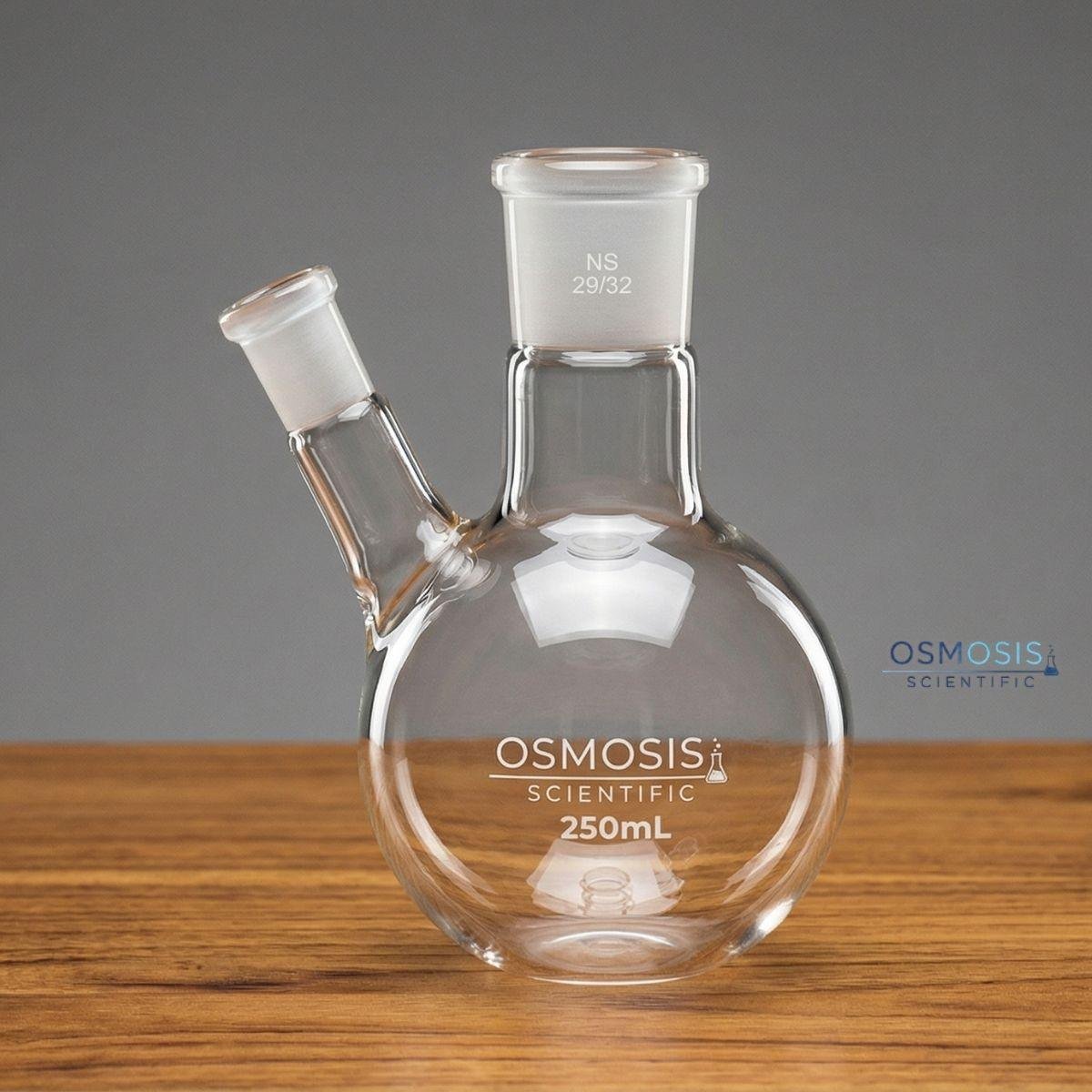 Round Bottom Flask, Two‑Neck, Angular, ASTM from OsmosisScientific is a borosilicate 3.3 distillation and reaction flask designed for demanding synthesis, reflux and solvent‑recovery work. The round bottom provides uniform heating in mantles and baths, while one vertical centre neck and one angled side neck with ASTM standard ground joints allow easy connection of condensers, thermometers, addition funnels or gas inlets in a compact setup.