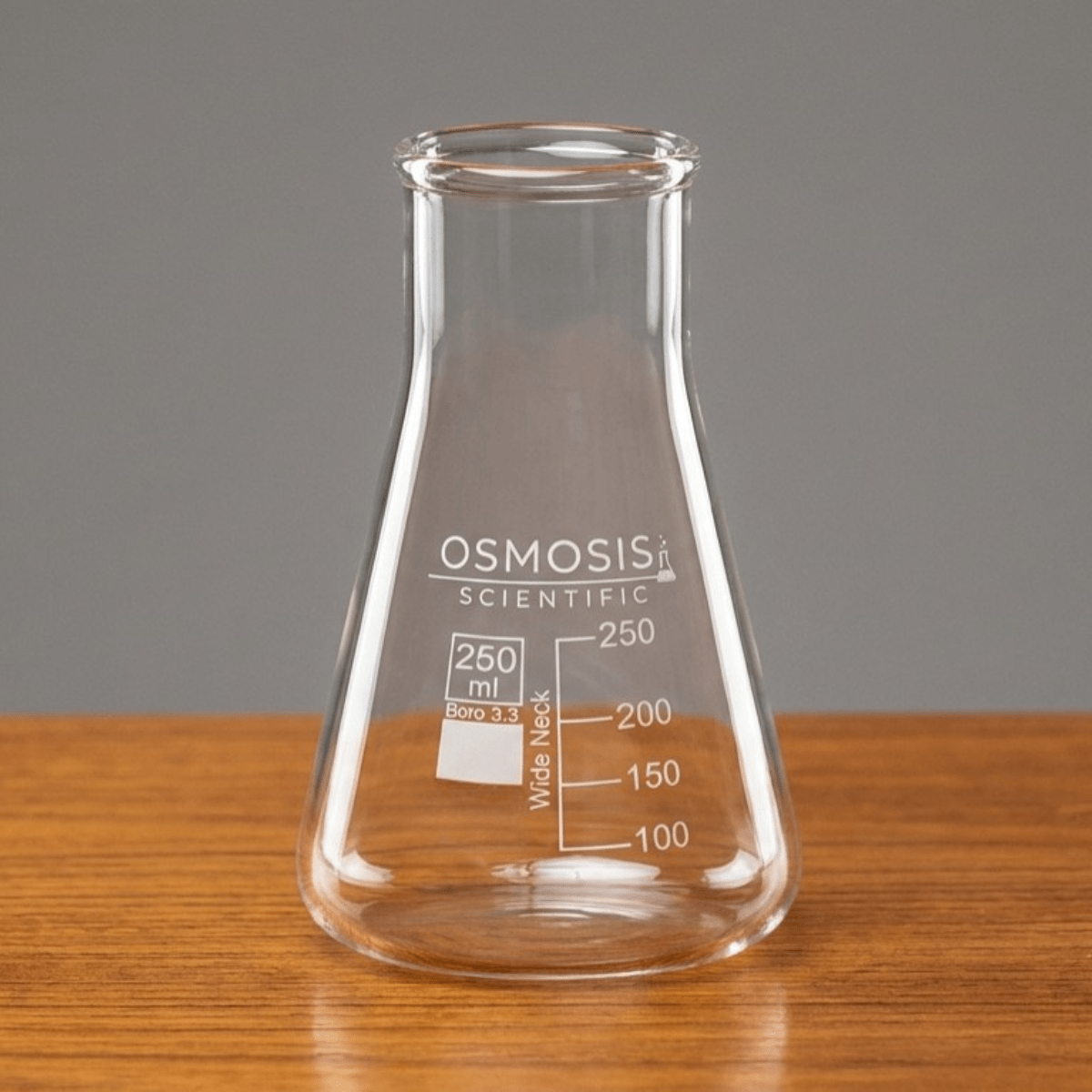 Most wide neck Erlenmeyer flasks are manufactured from borosilicate 3.3 glass, offering high thermal shock resistance, chemical durability, and autoclavability for sterile work.
